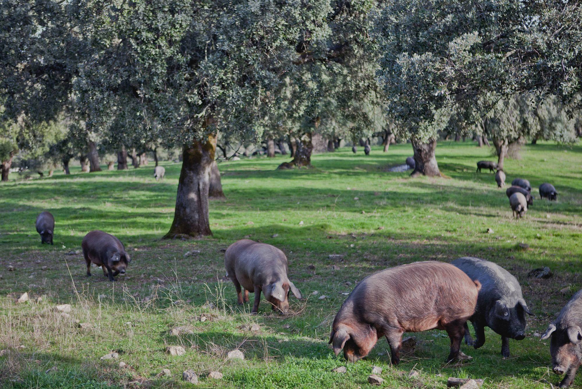 Carrasco 的伊比利豬皆來自自有牧場,豬隻放養於橡木林近兩年的時間,春天食用草地的香草、野花、樹根、小蟲等;因為西班牙此區的夏季酷熱,草地容易乾枯,沒有充足的自然資源,此Carrasco 的牧豬人會給豬隻們食用八種天然穀物;到了秋季,橡樹陸陸續續結果、落地,這時候就是豬隻們最快樂的時候,每天可以吃超過10 公斤的橡果,並有超過三公頃的橡果林可以躲藏玩耍。